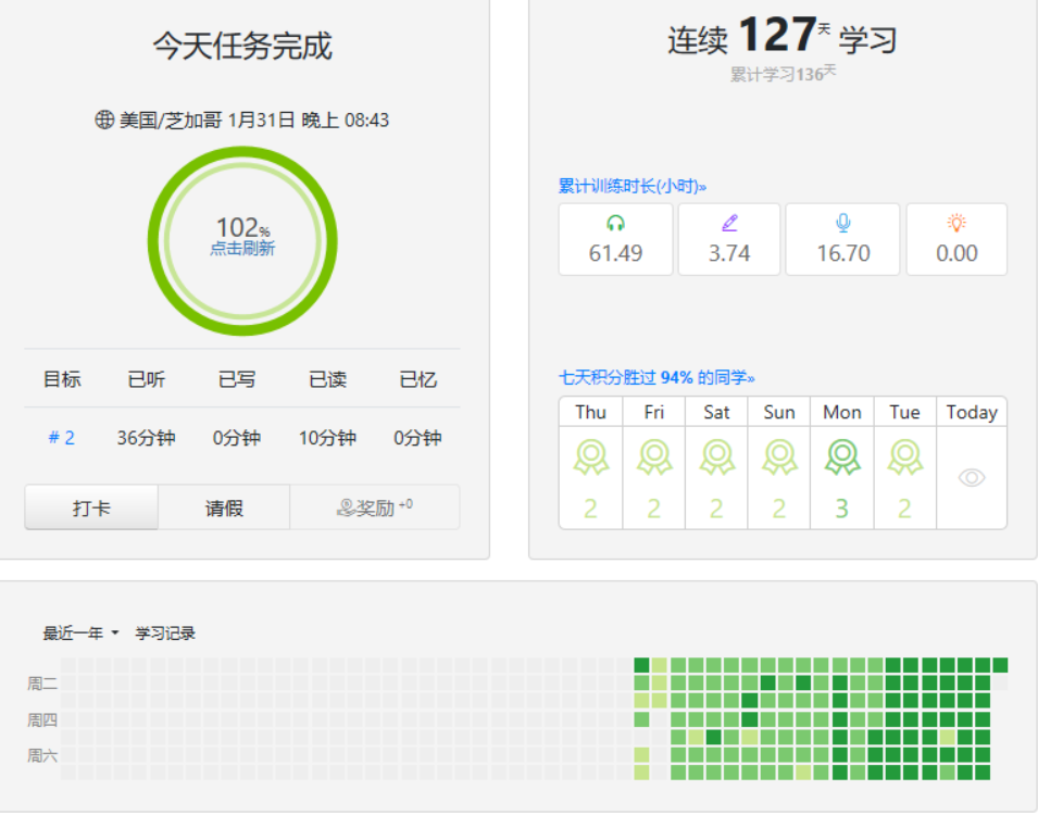 设定一个目标,每天坚持完成打卡,坚持一段时间,一定能有效果。我比较喜欢它的下面这个界面,有没有找到github的感觉?