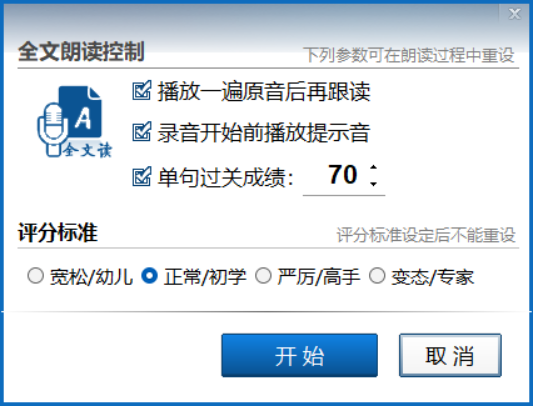 新手注意刚开始的时候,评分标准不要设得太高哦,另外如果下载的课件有背景音乐,也需要调低“单句过关分数”。
